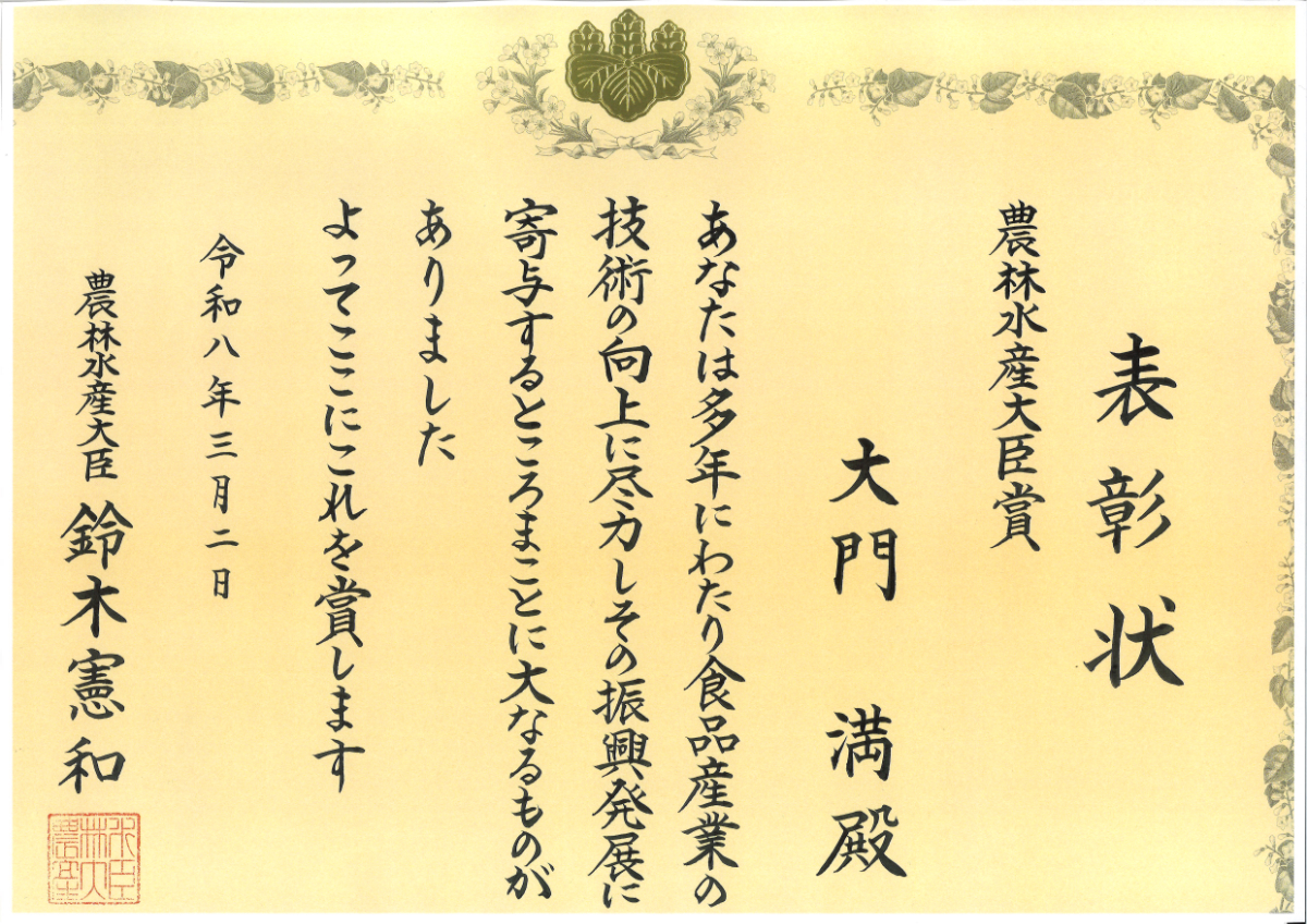 このたび、弊社取締役 大門 満 は、「 第47回食品産業優良企業等表彰 」において、「 農林水産大臣賞 」を受賞いたしました。